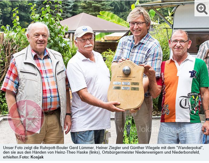 Nach fünf gewonnenen Spielen auf dem hervorragend präparierten Boule-Platz am "Freizeit-Domizil-Ruhrtal" trafen im Finale die Boulefreunde der Nikolaus-Groß-Straße aus Niederwenigern (Holger und Horst Hacke, Jürgen Gentzmer) auf die Ruhrpott-Bouler Gerd Lümmer, Heiner Ziegler und Günther Wiegele. In einer äußerst spannenden Partie gewannen die Ruhrpott-Bouler mit 13:10 und verteidigten damit ihren Stadtmeister-Titel.