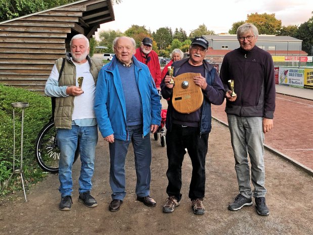 ![]() Ortsbürgermeister Teo Haske (2.v.l.) überreichte den Siegerpokal der Hattinger Boule-Stadtmeisterschaft an die erste Mannschaft der Ruhrpott-Camper um Horst Krebs, Gerd Lümmer und Heiner Ziegler. Foto: Martina Rehbein |